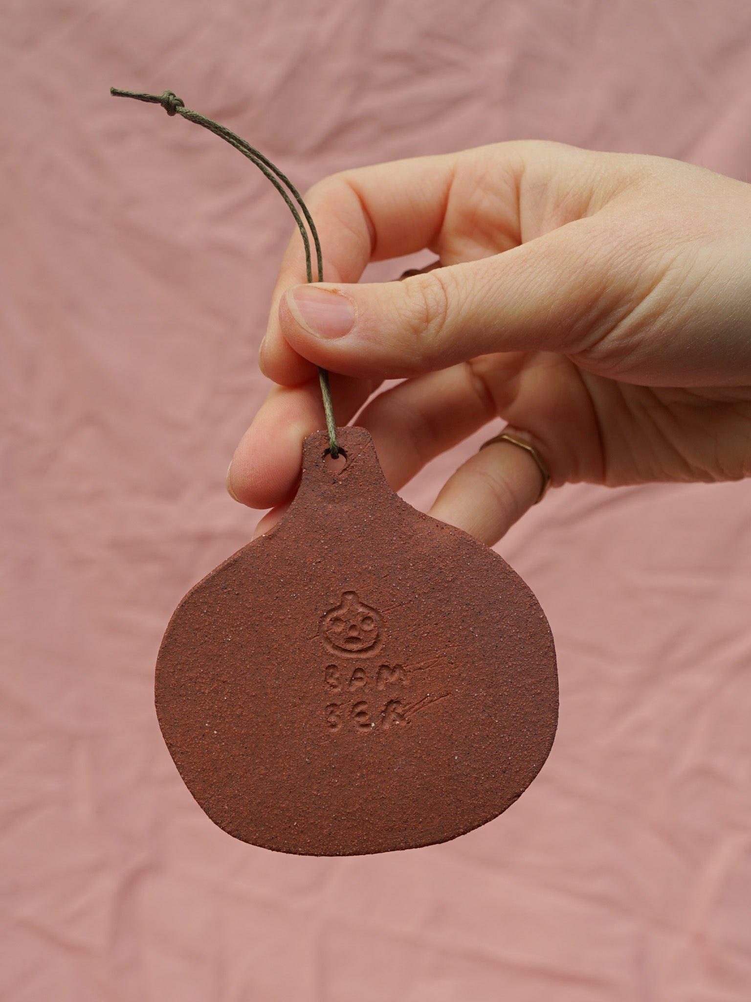 Terracotta pumpkin-shaped hanging ornament, painted with wax resist and coated with bright orange, dark green and light blue glazes