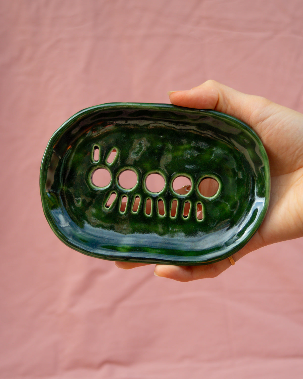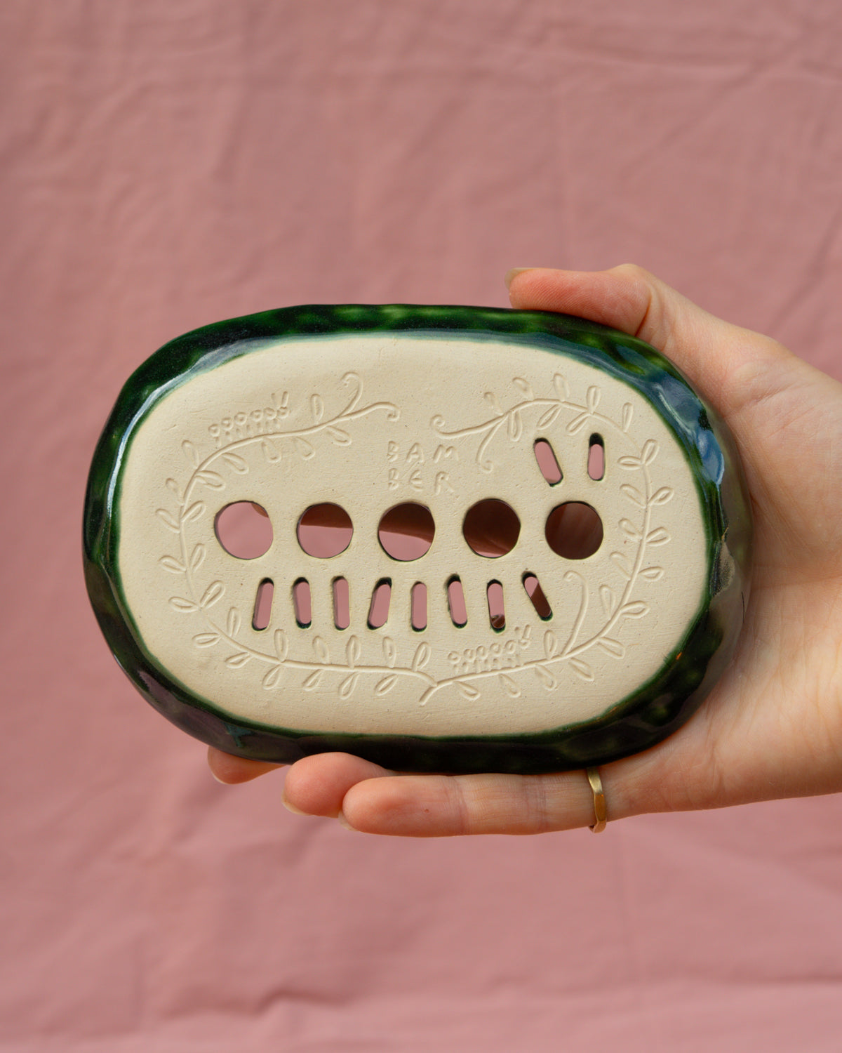 Soap or sponge dishes with a caterpillar cut-out design , made from white clay and painted with a dark green glaze