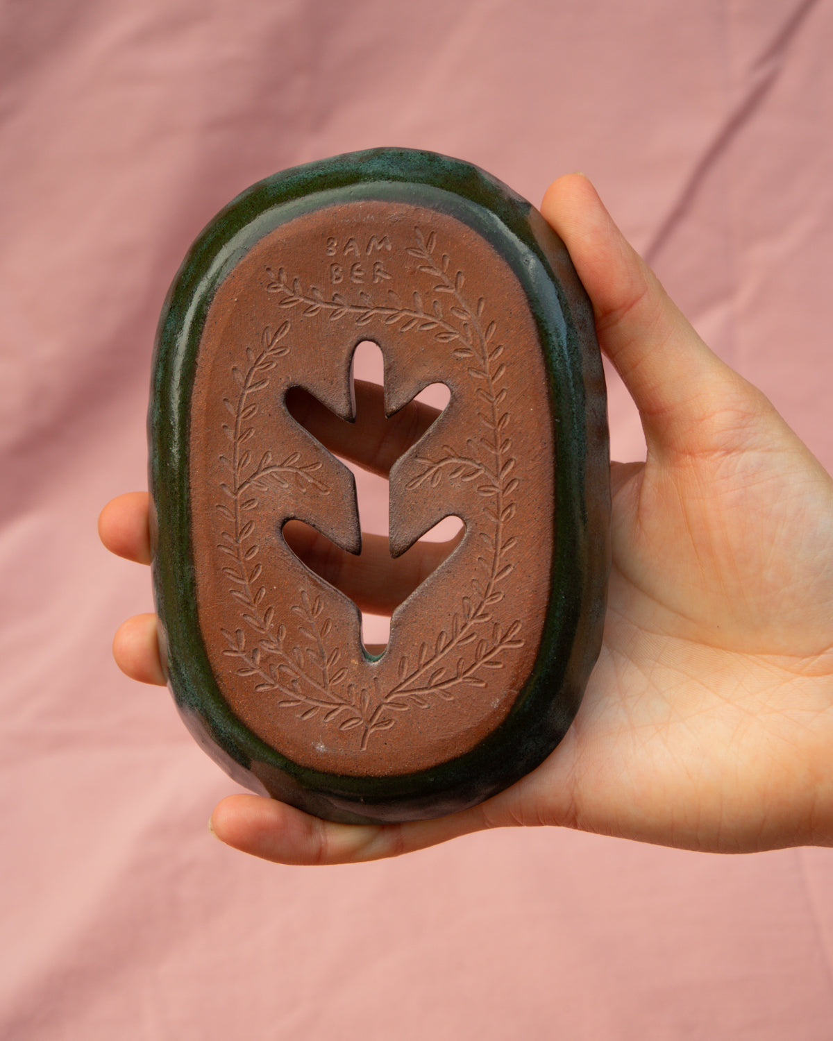 Soap or sponge dishes with a flower cut-out design , made from terracotta clay and painted with a mottled turquoise-blue glaze