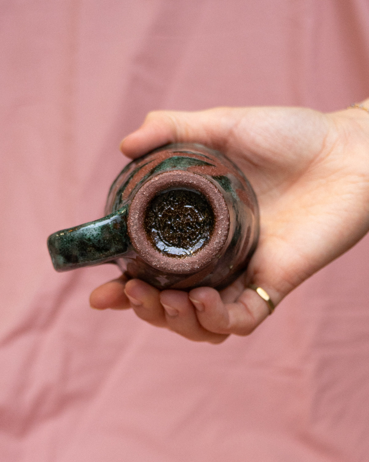 Tiny terracotta mug painted with wax resist in an flower pattern and coated in a blobby green-turquoise glaze