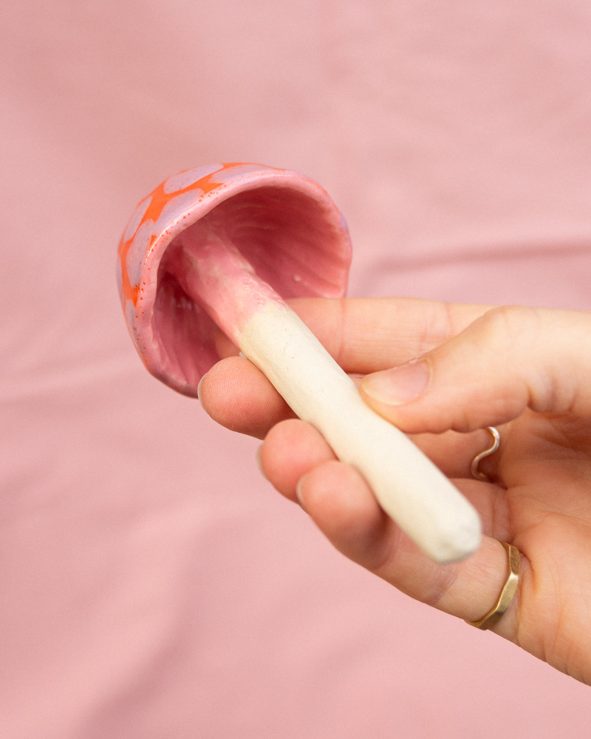 White clay mushroom, painted with orange, lilac + pink glazes and made to stand in a plant pot or around the garden
