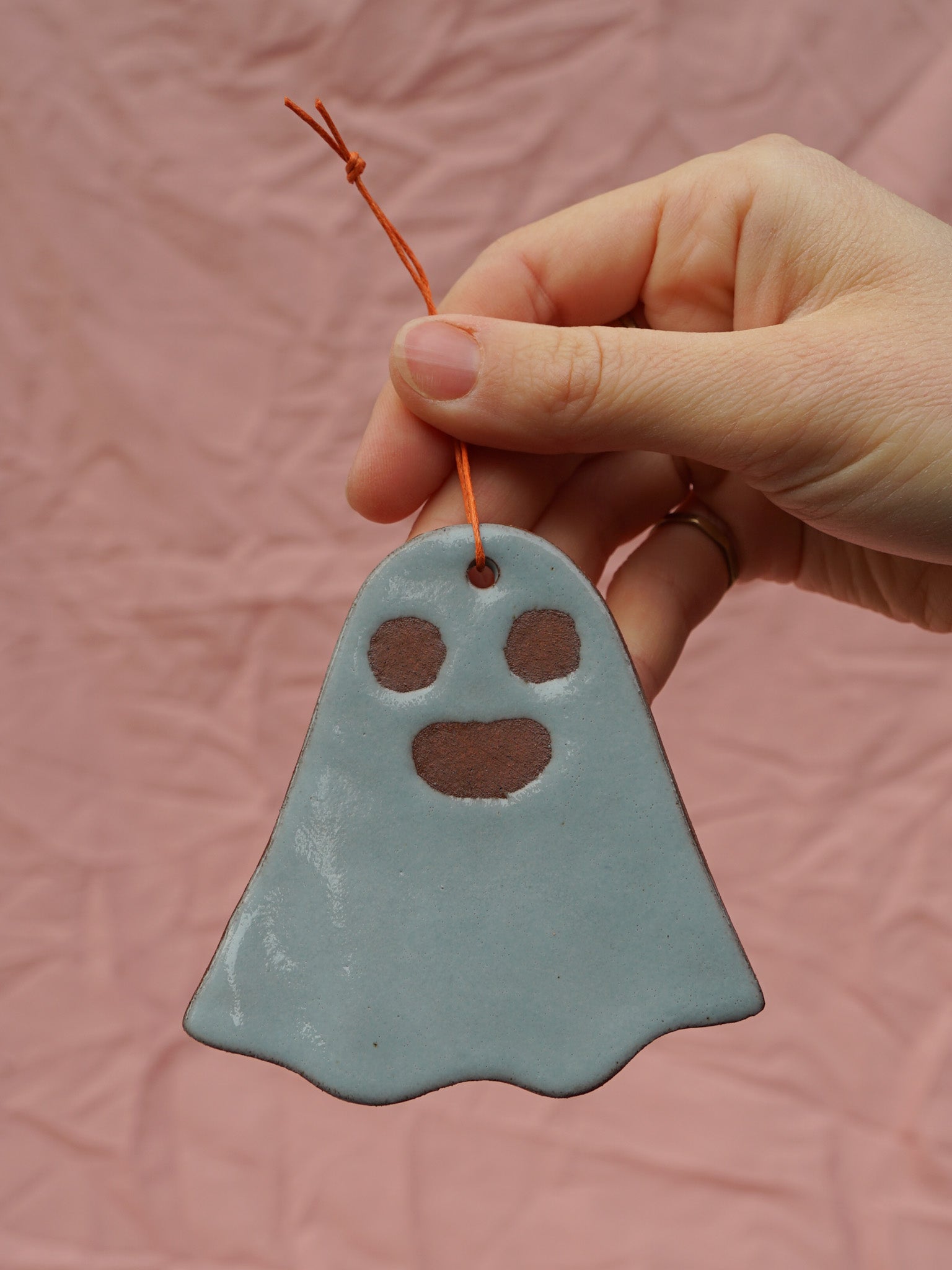 Terracotta ghost-shaped hanging ornament, painted with wax resist and coated with a light blue glaze