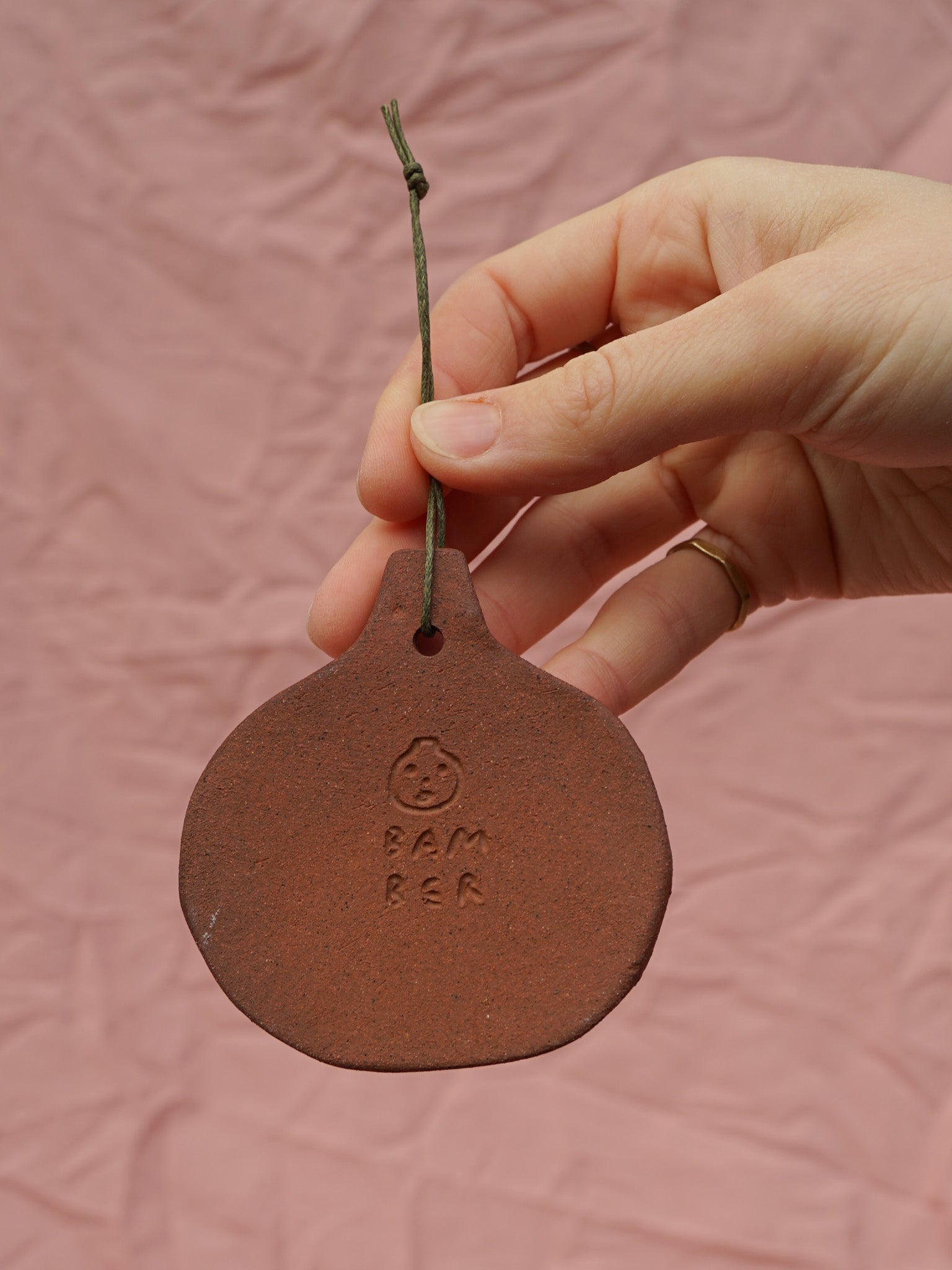 Terracotta pumpkin-shaped hanging ornament, painted with wax resist and coated with bright orange and dark green glazes