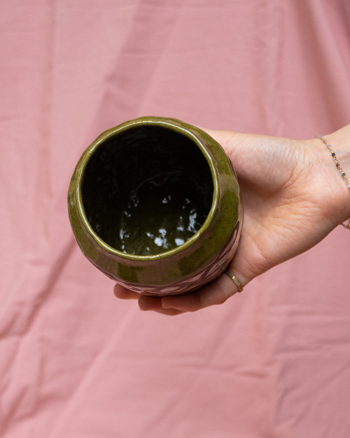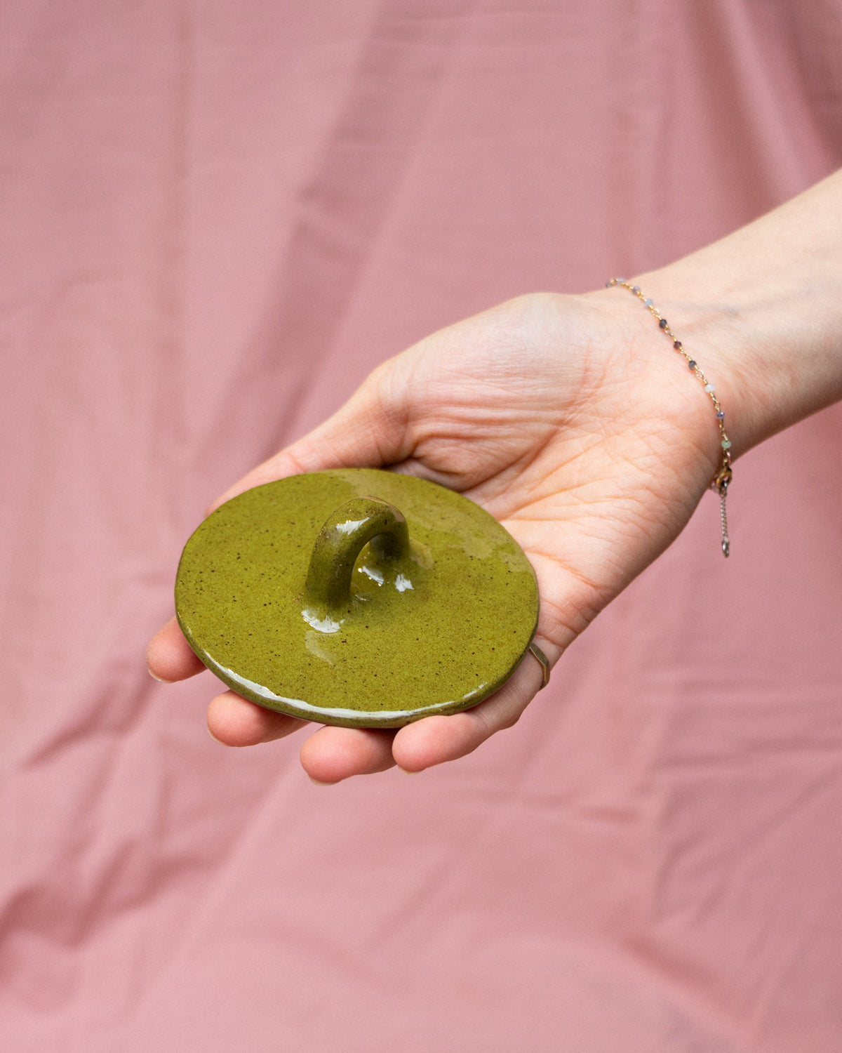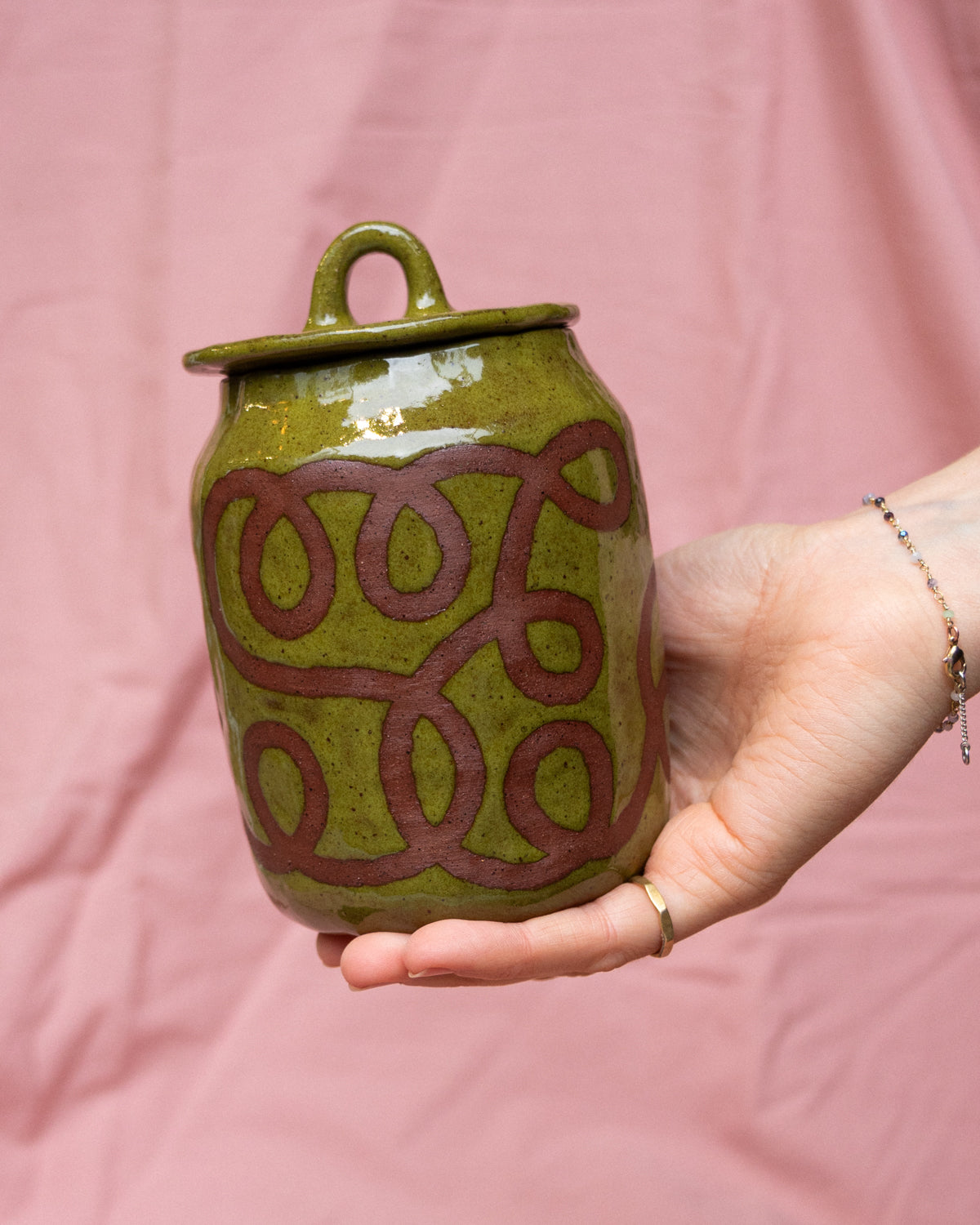 Lidded terracotta jar, painted with wax resist and coated with a speckled olive green glaze