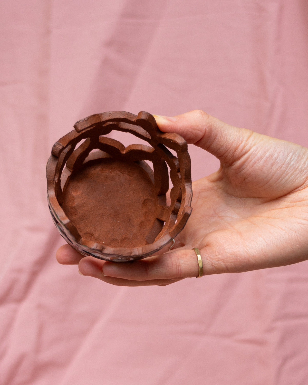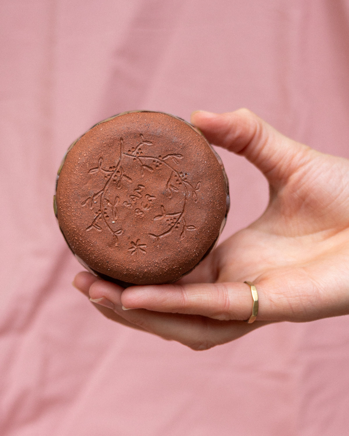 Terracotta pot engraved and cut to reveal a repeating mistletoe berry + leaf pattern, and painted with light blue, olive and dark green glazes