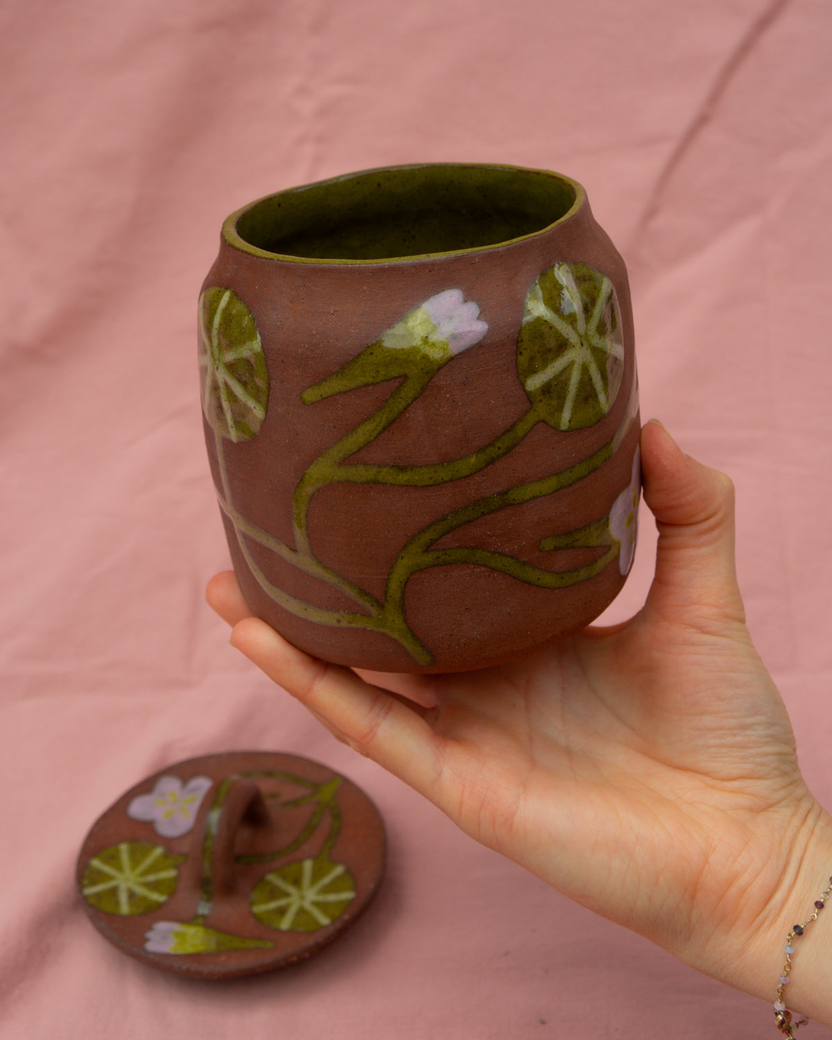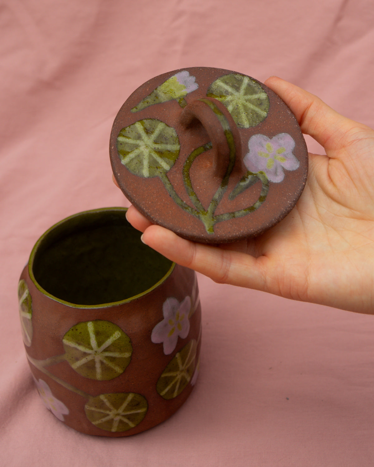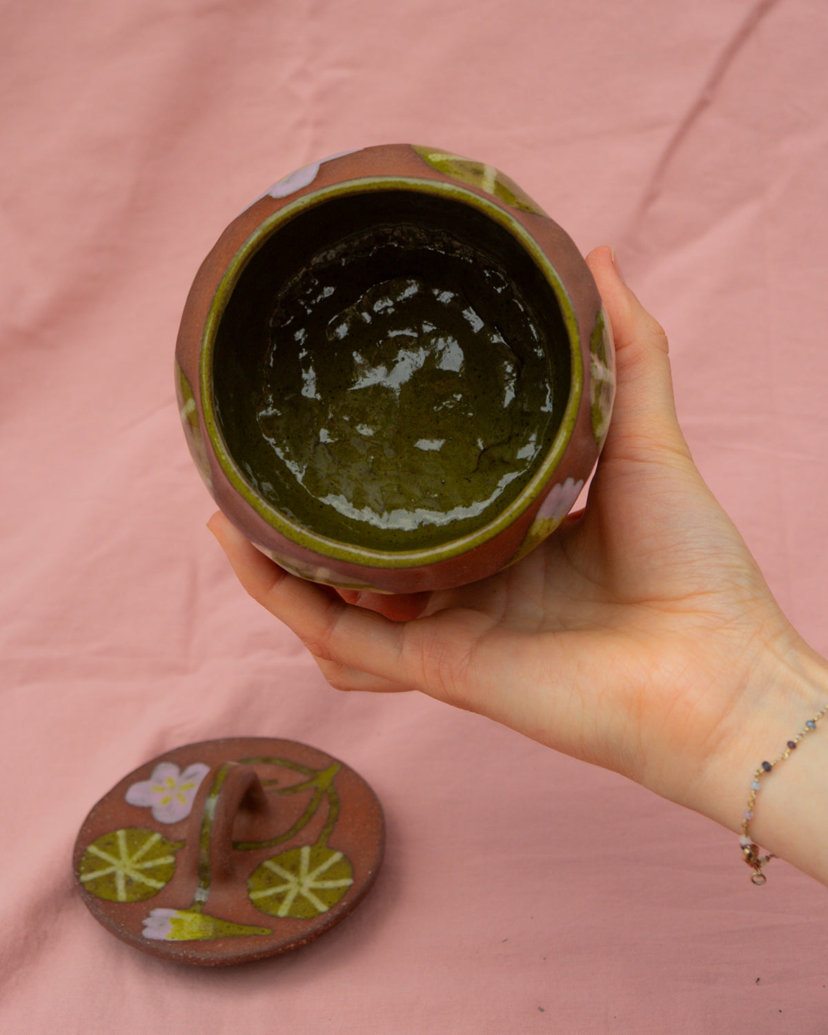 Lidded terracotta jar, glazed with lilac and olive green nasturtium flowers and leaves, and otherwise kept unglazed. Coated with an olive green glaze on the inside of the pot + underside of the lid