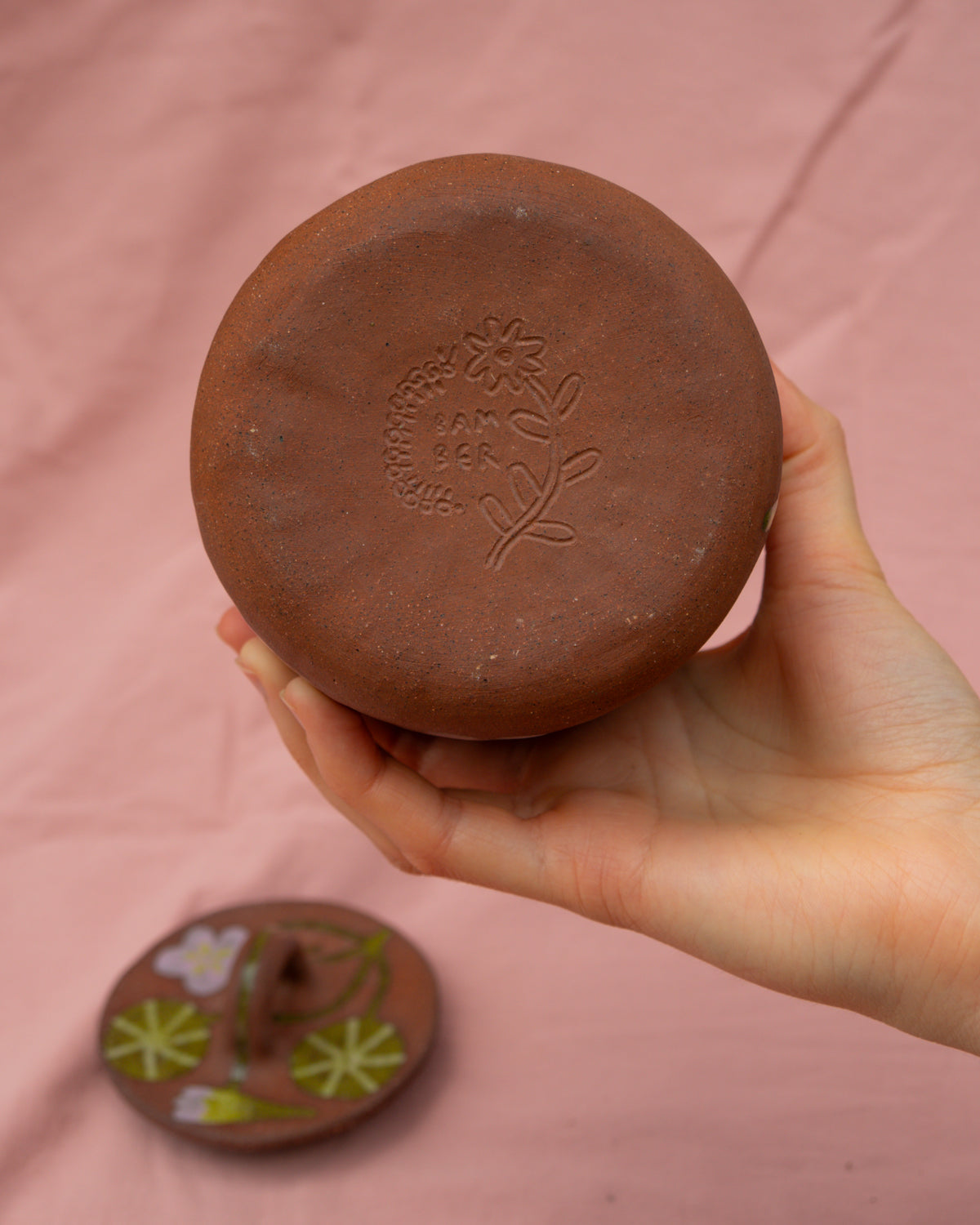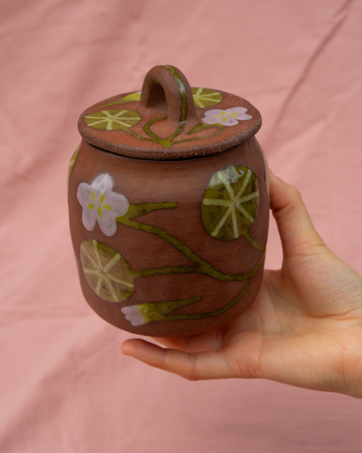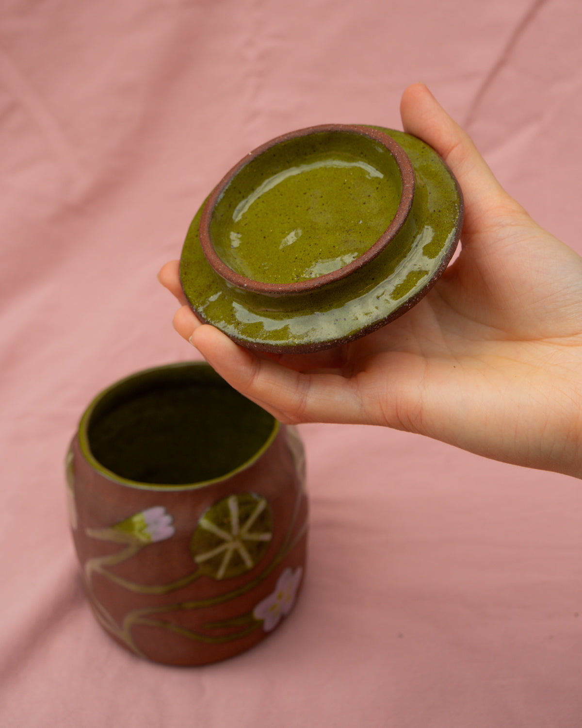 Lidded terracotta jar, glazed with lilac and olive green nasturtium flowers and leaves, and otherwise kept unglazed. Coated with an olive green glaze on the inside of the pot + underside of the lid