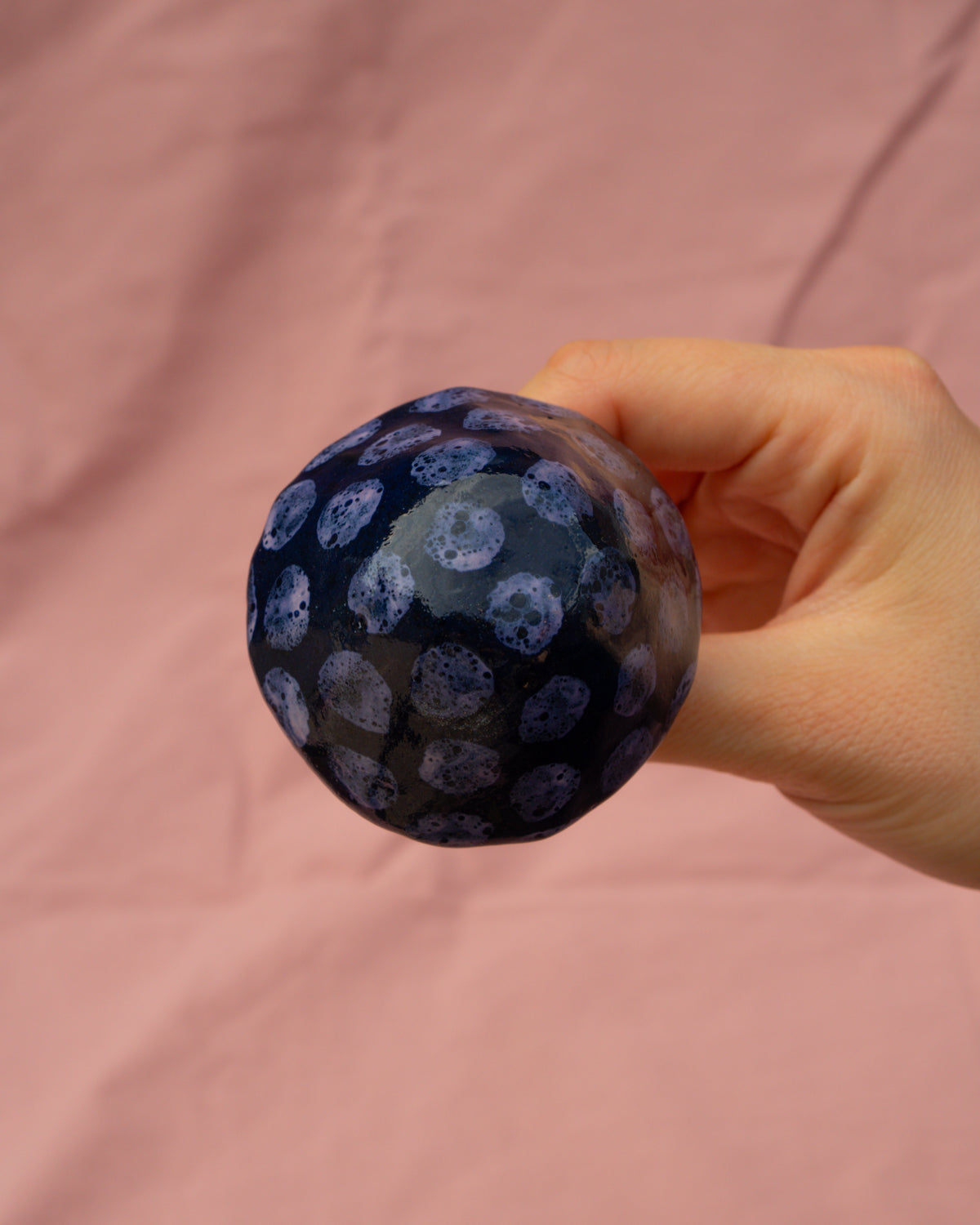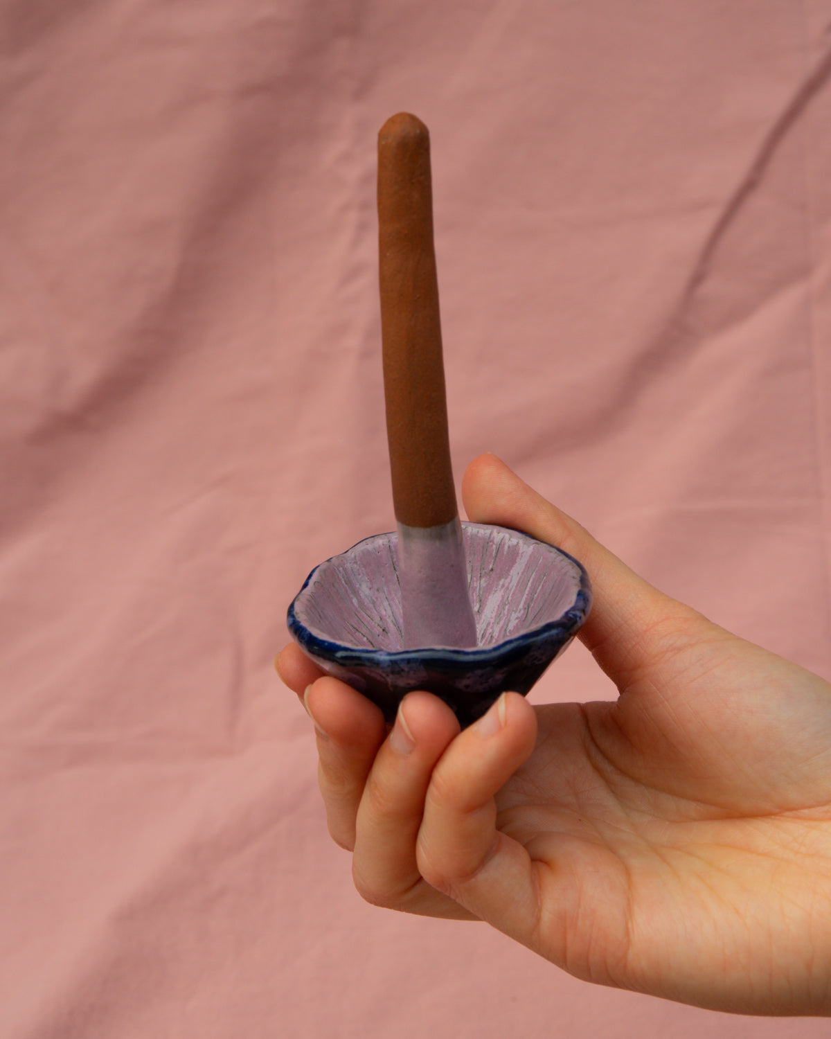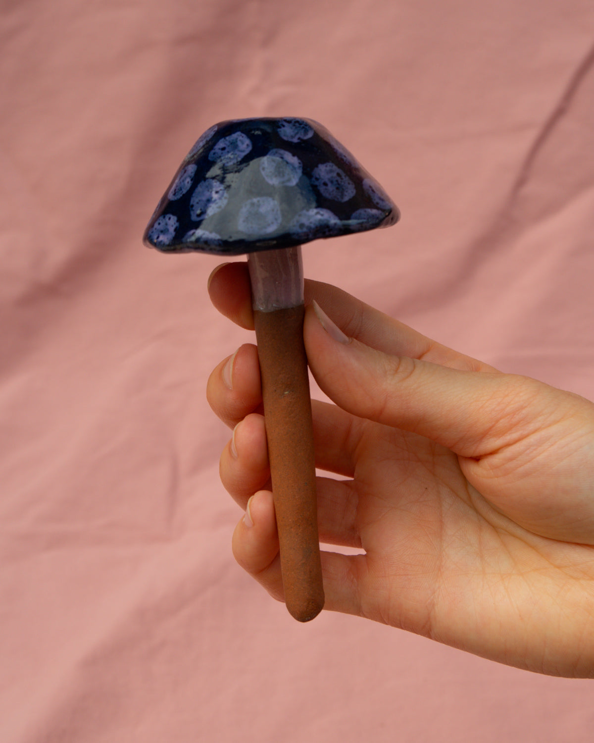 Terracotta mushroom, painted with navy blue + lilac glazes and made to stand in a plant pot or around the garden