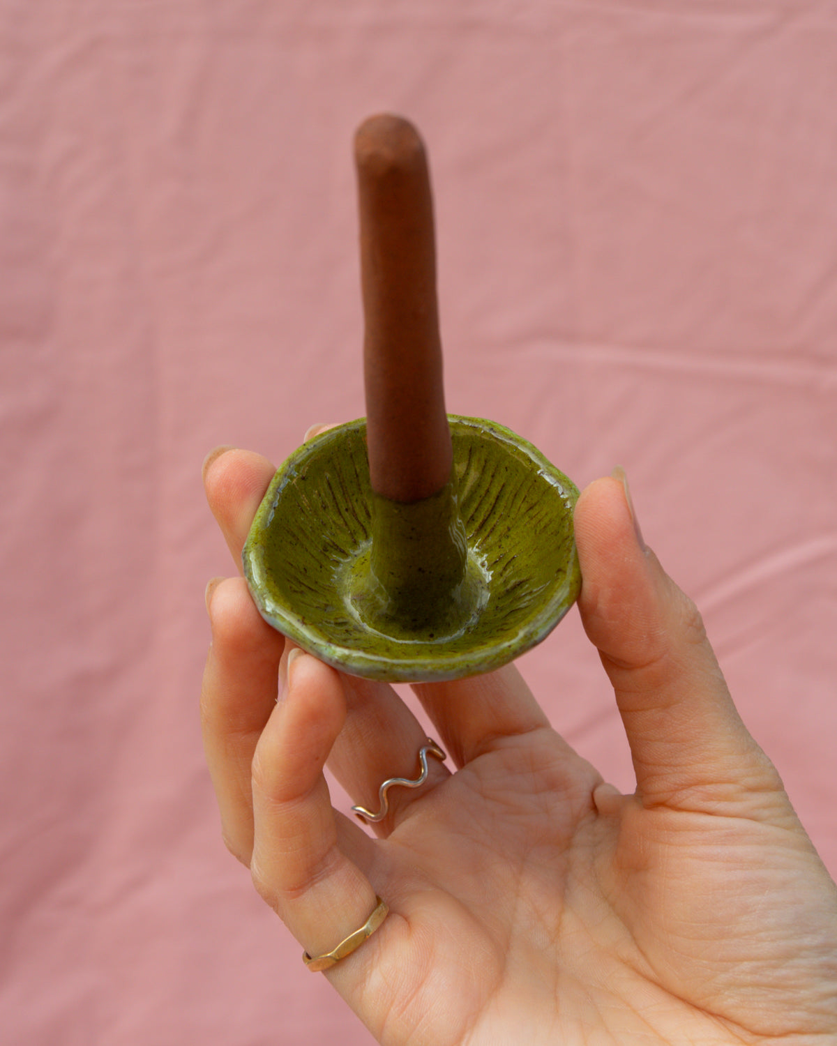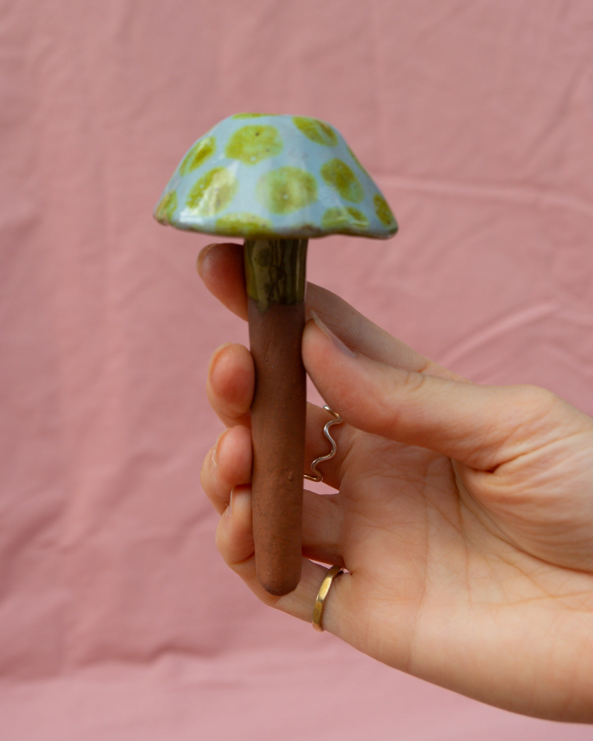 Terracotta mushroom, painted with light blue + olive green glazes and made to stand in a plant pot or around the garden