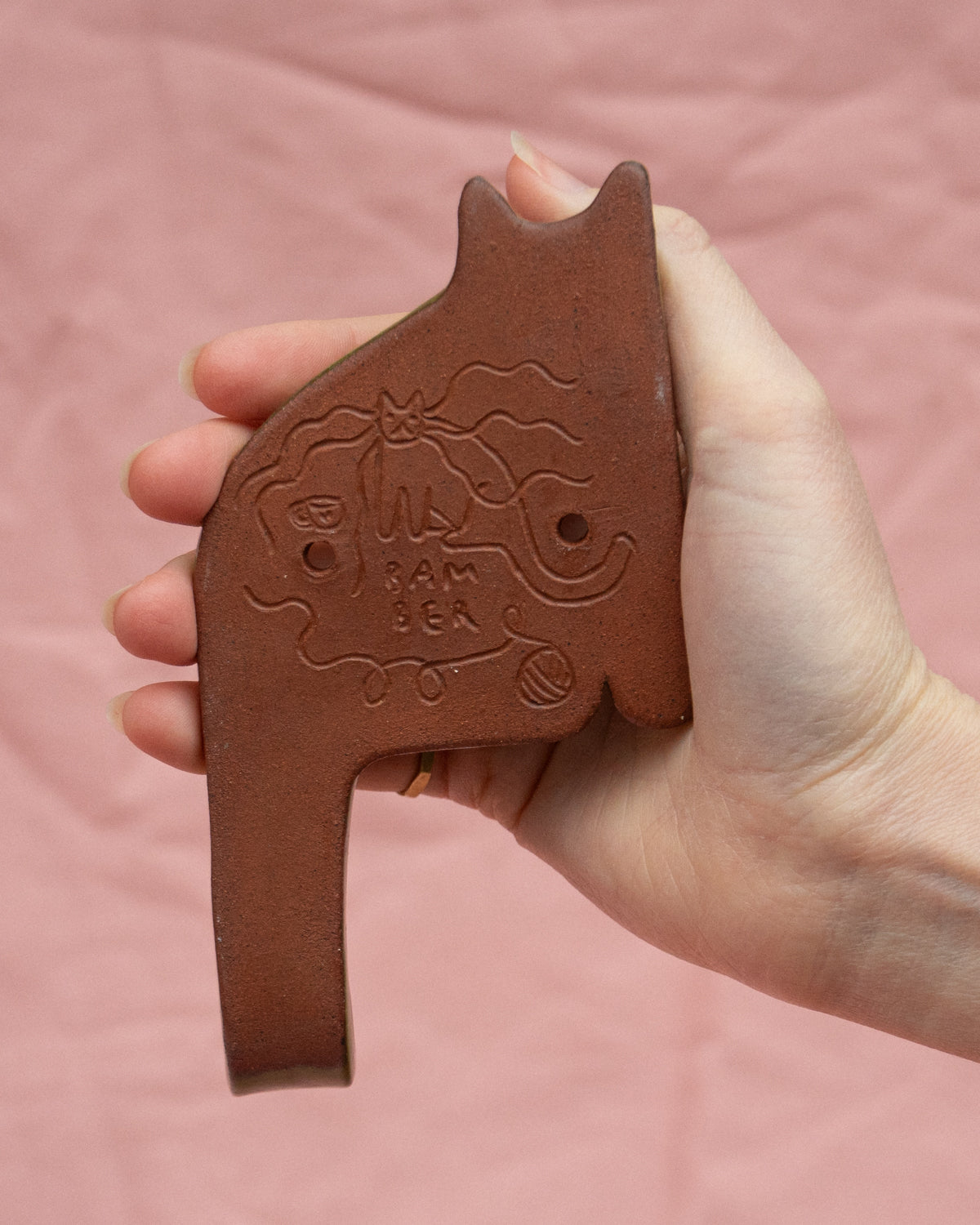 Terracotta cat-shaped wall hook, painted with wax resist and coated in a speckled olive glaze