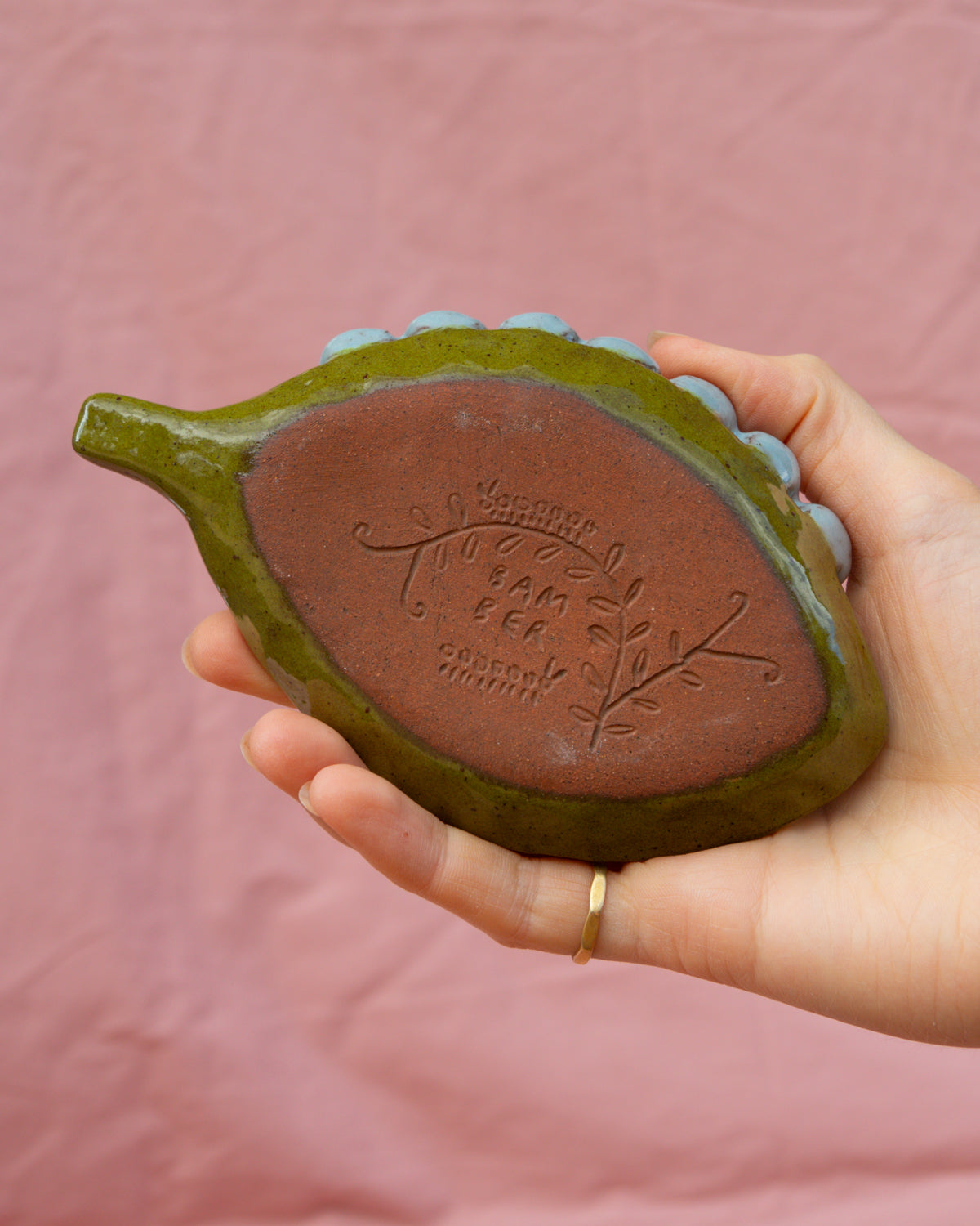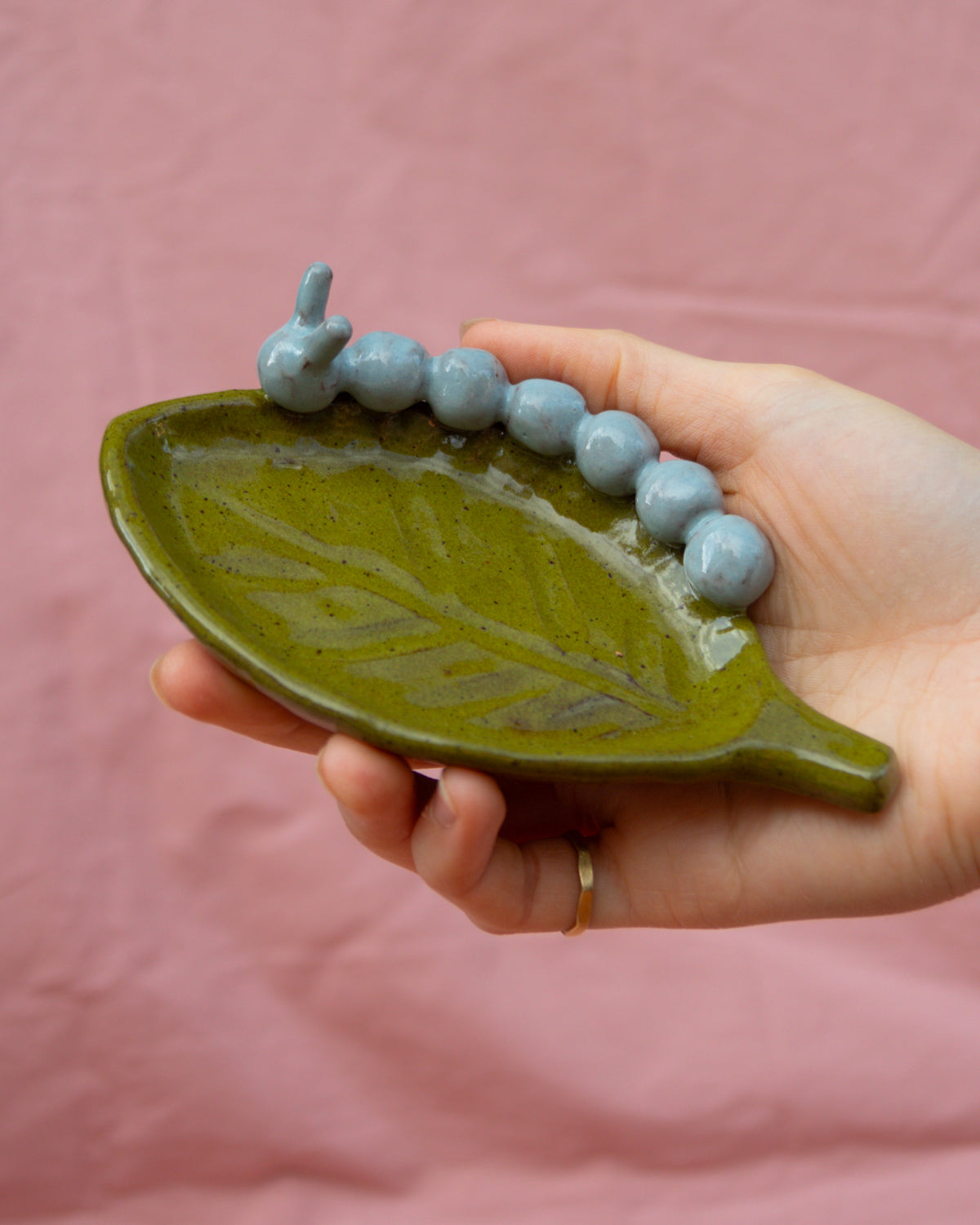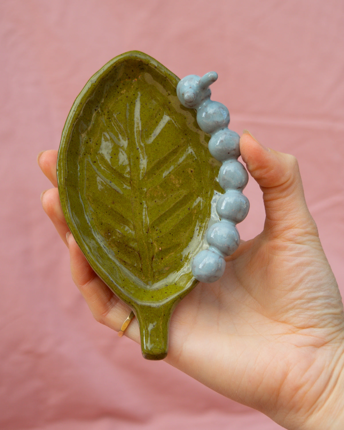 Terracotta leaf plate with a caterpillar sitting on the edge, coated in olive green and light blue glazes