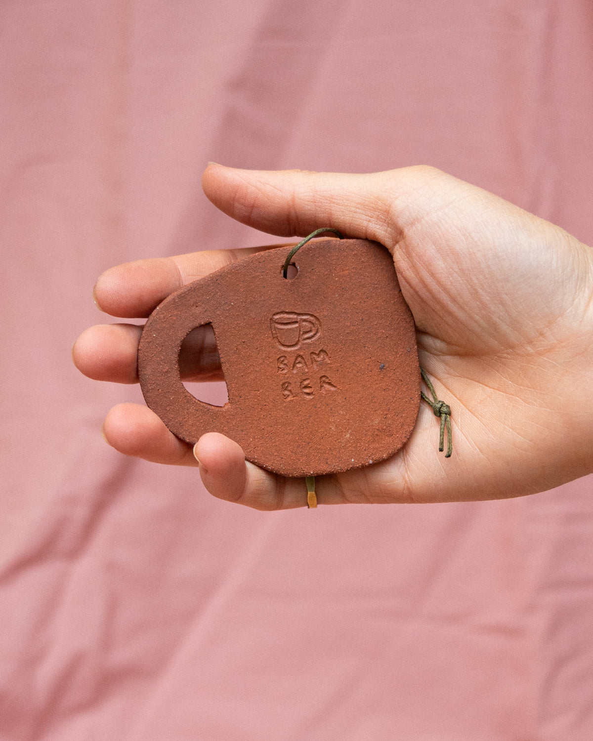 Terracotta mug-shaped hanging ornament, painted with wax resist and coated with a mottled purple glaze