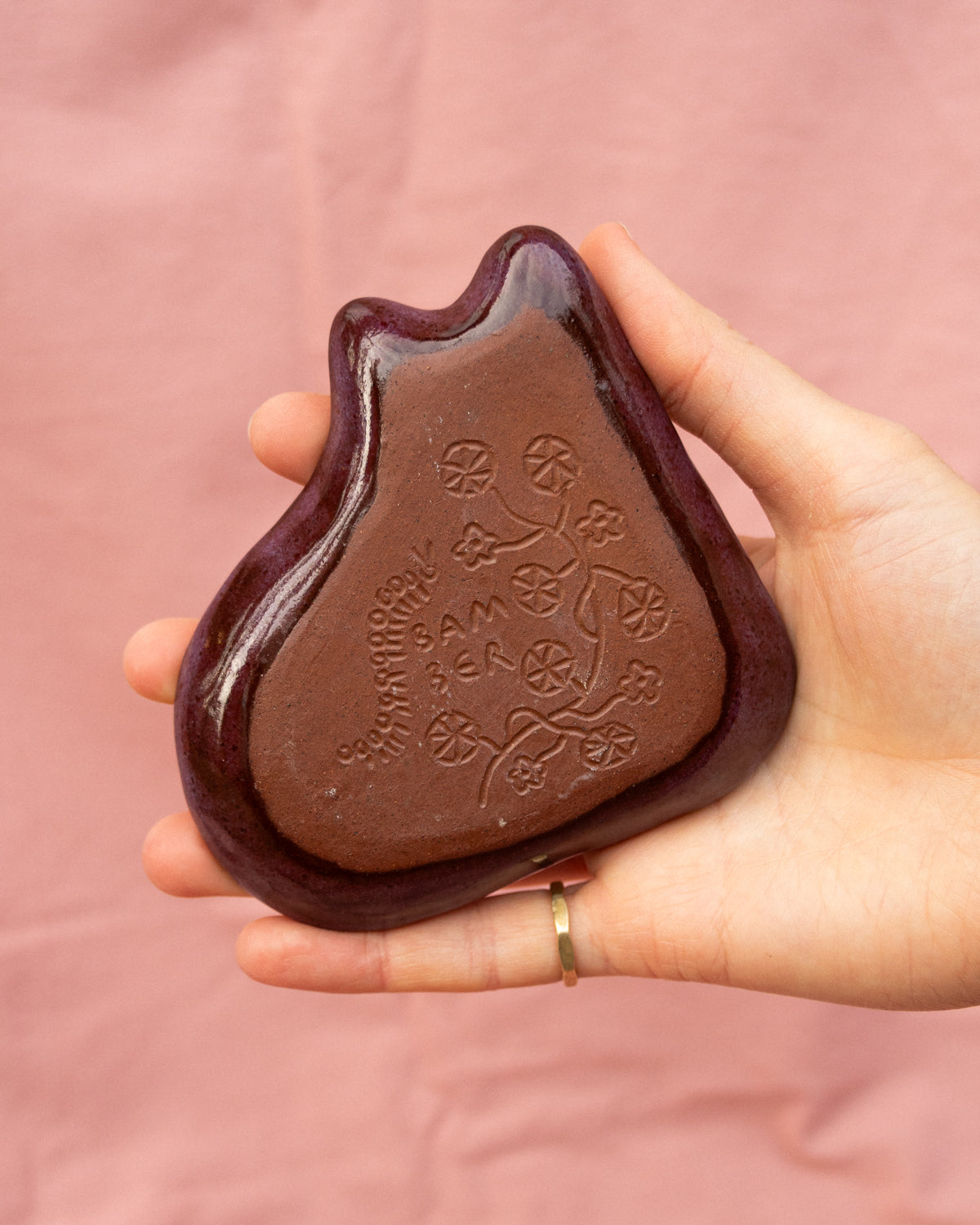 Small terracotta cat-shaped plate, painted with wax resist and coated in a mottled purple glaze