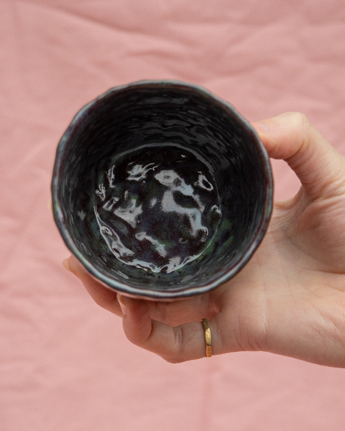 Terracotta cups engraved with circle patterns and coated in a mottled green-purple glaze