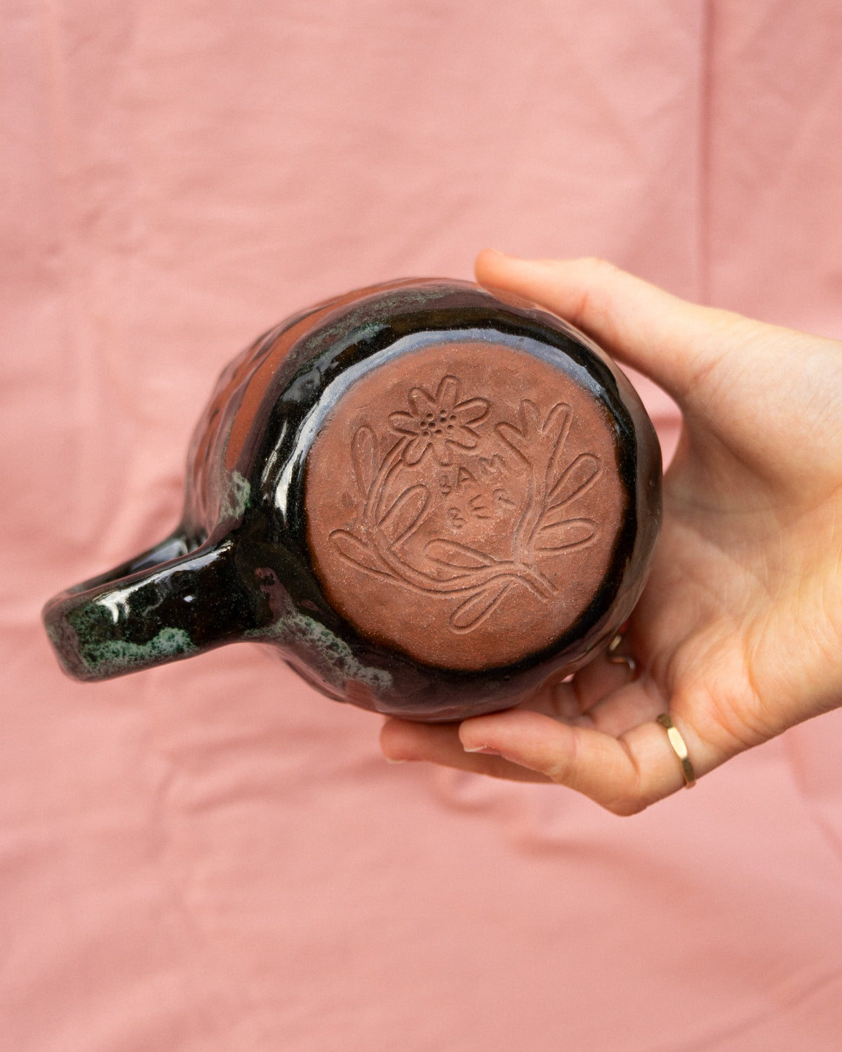 Big terracotta mug painted with wax resist in a flower and star pattern and coated in a blobby green-turquoise glaze