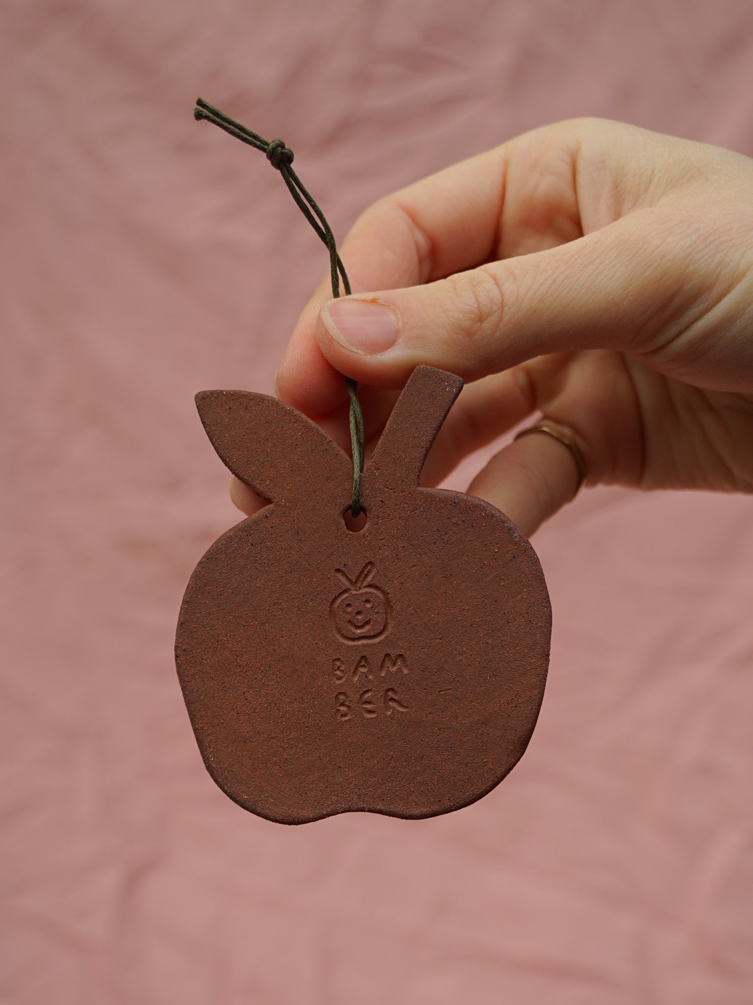 Terracotta apple-shaped hanging ornament, painted with wax resist and coated with red, forest green and olive green glazes