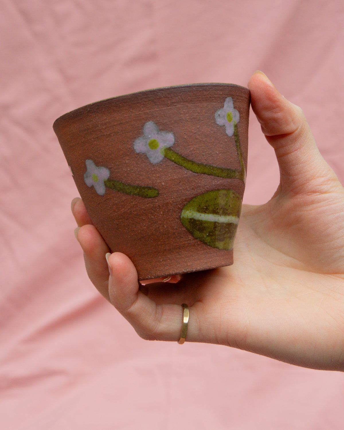 Small terracotta bowl decorated with lilac and olive glazed flowers on an otherwise unglazed outer surface, coated with olive green on the inside