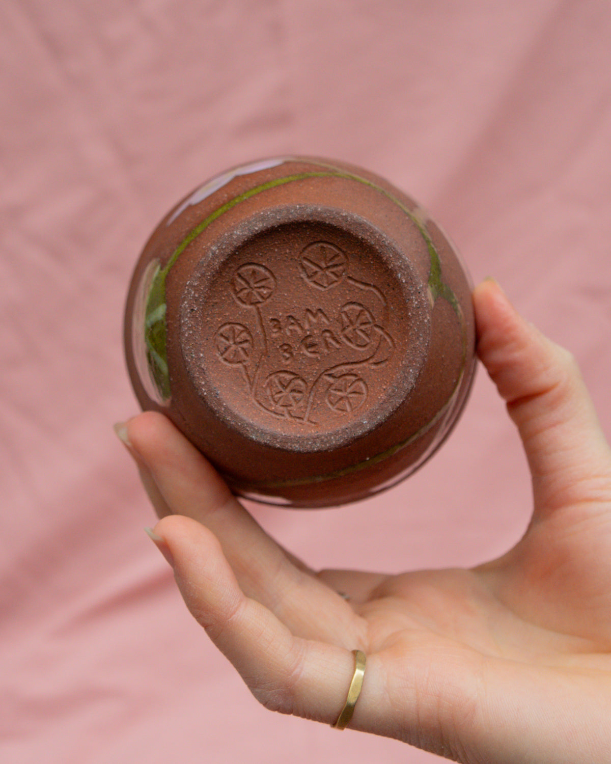 Small terracotta bowl decorated with lilac and olive glazed nasturtium flowers on an otherwise unglazed outer surface, coated with olive green on the inside