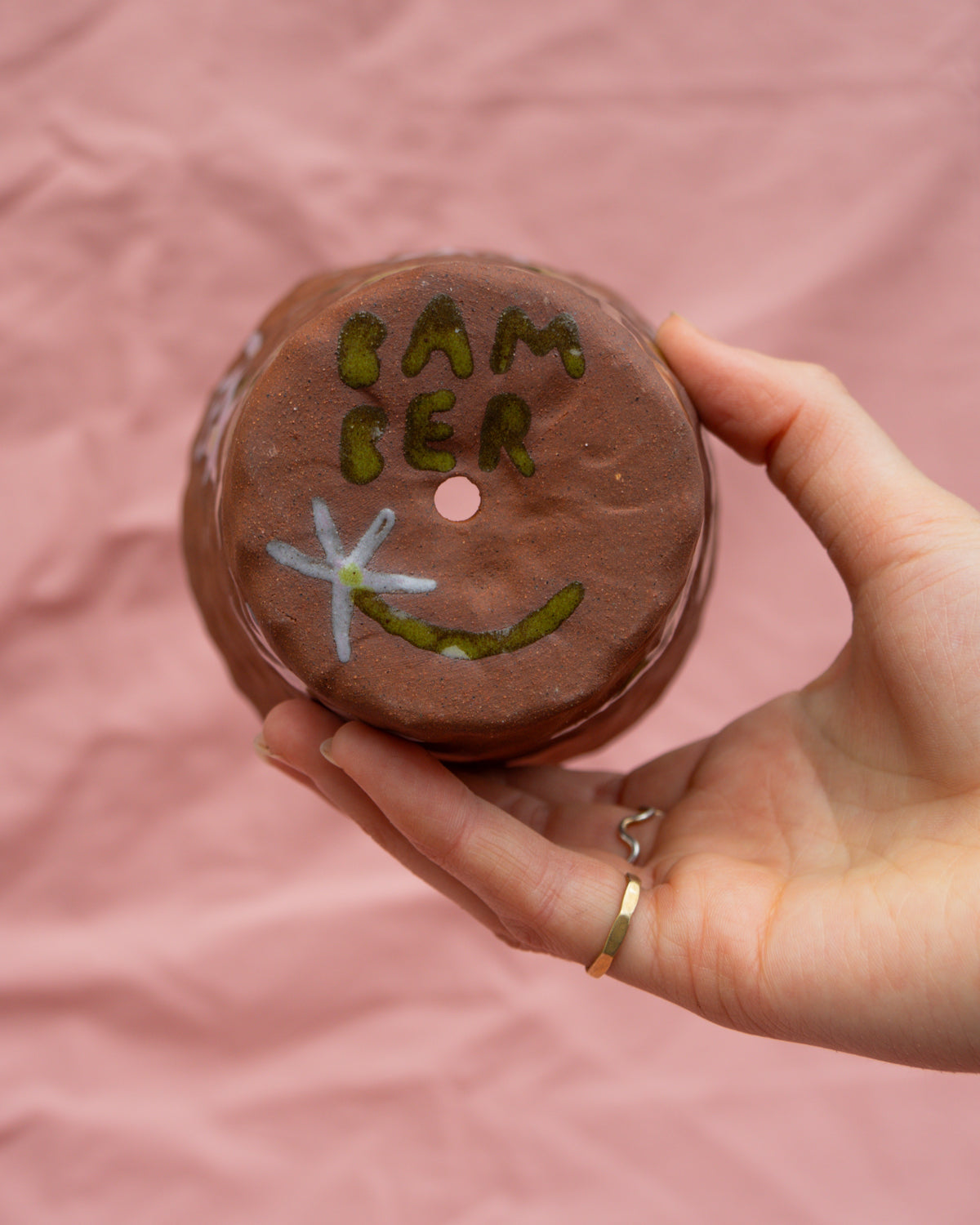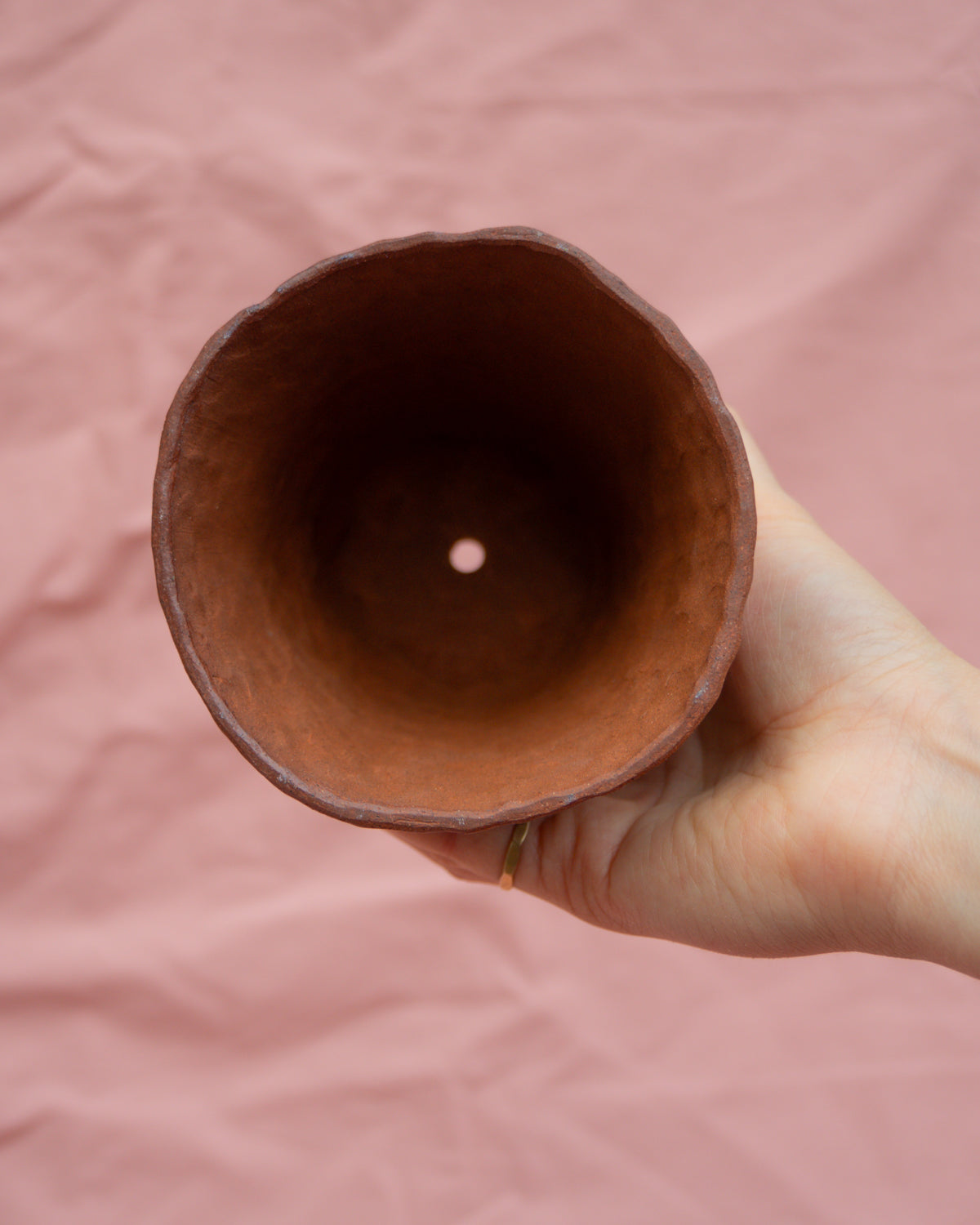 Small terracotta plant pot painted with glaze in flower patterns all around
