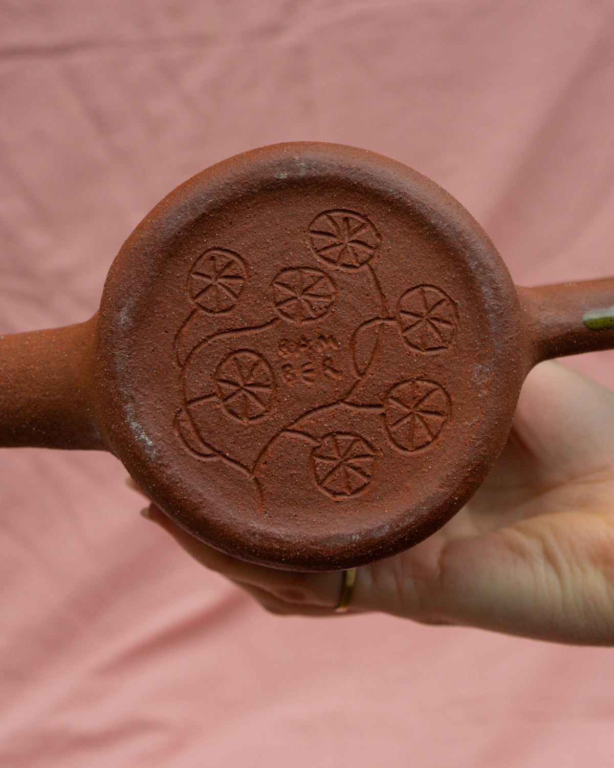 Terracotta watering can pot decorated with lilac and olive glazed flowers on an otherwise unglazed outer surface, coated with olive green on the inside. Made to water small plants, or keep as a beautiful object on a shelf :-) If using to water plants, tilt the pot backwards to prevent water from coming out while it's being filled up, and slowly tilt forwards to pour out