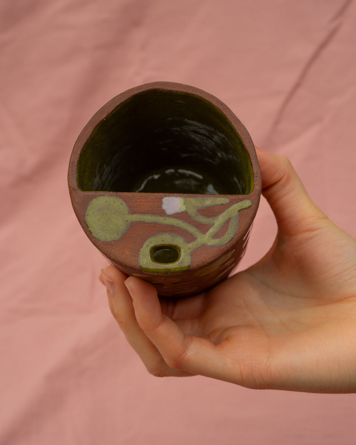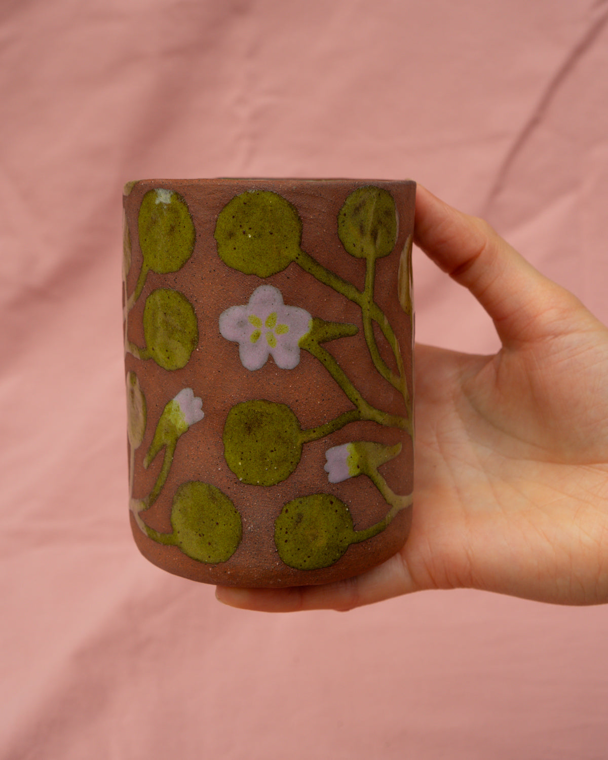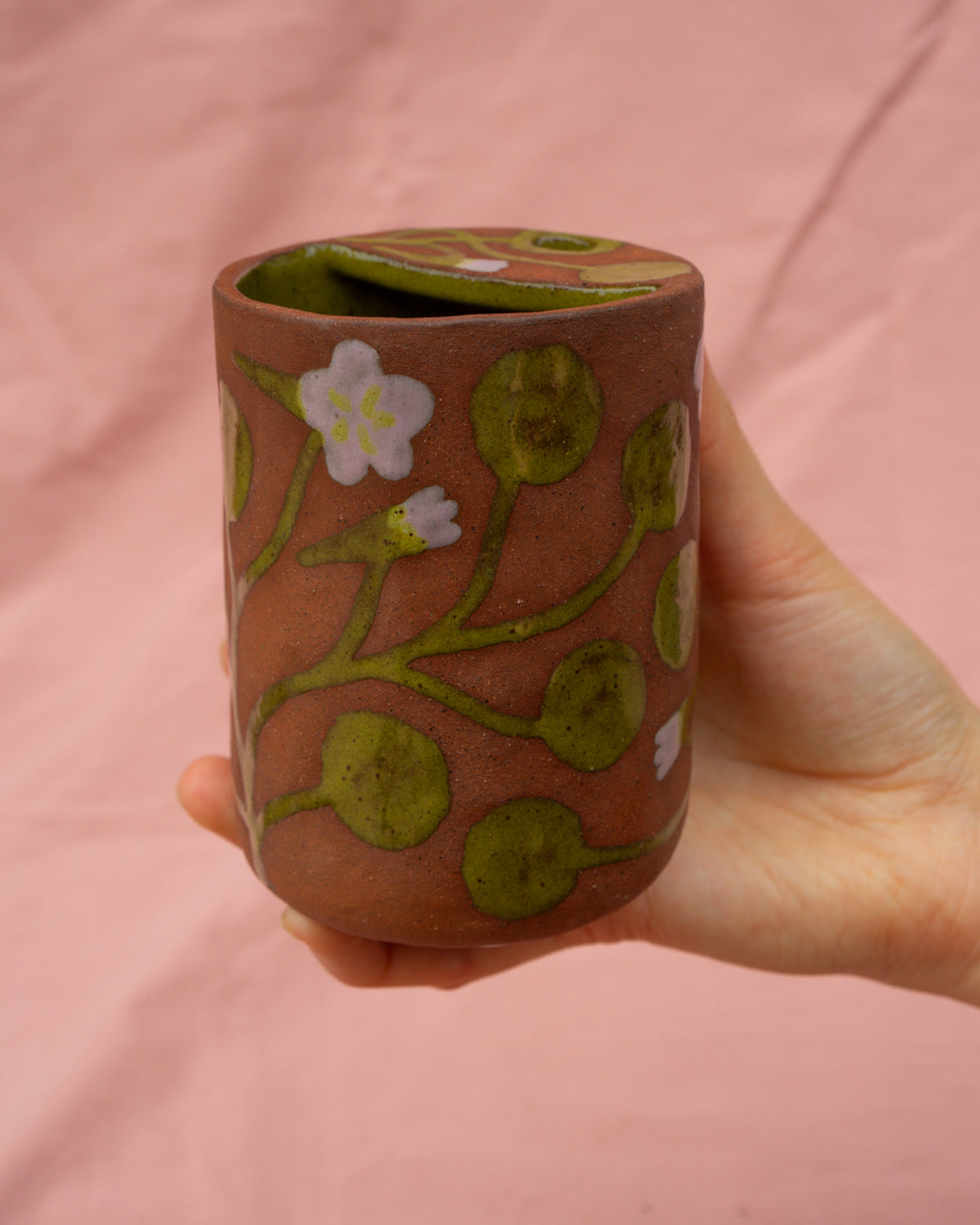 Terracotta travel cup decorated with lilac and olive glazed nasturtium leaves and flowers on an otherwise unglazed outer surface, coated with an olive green glaze on the inside