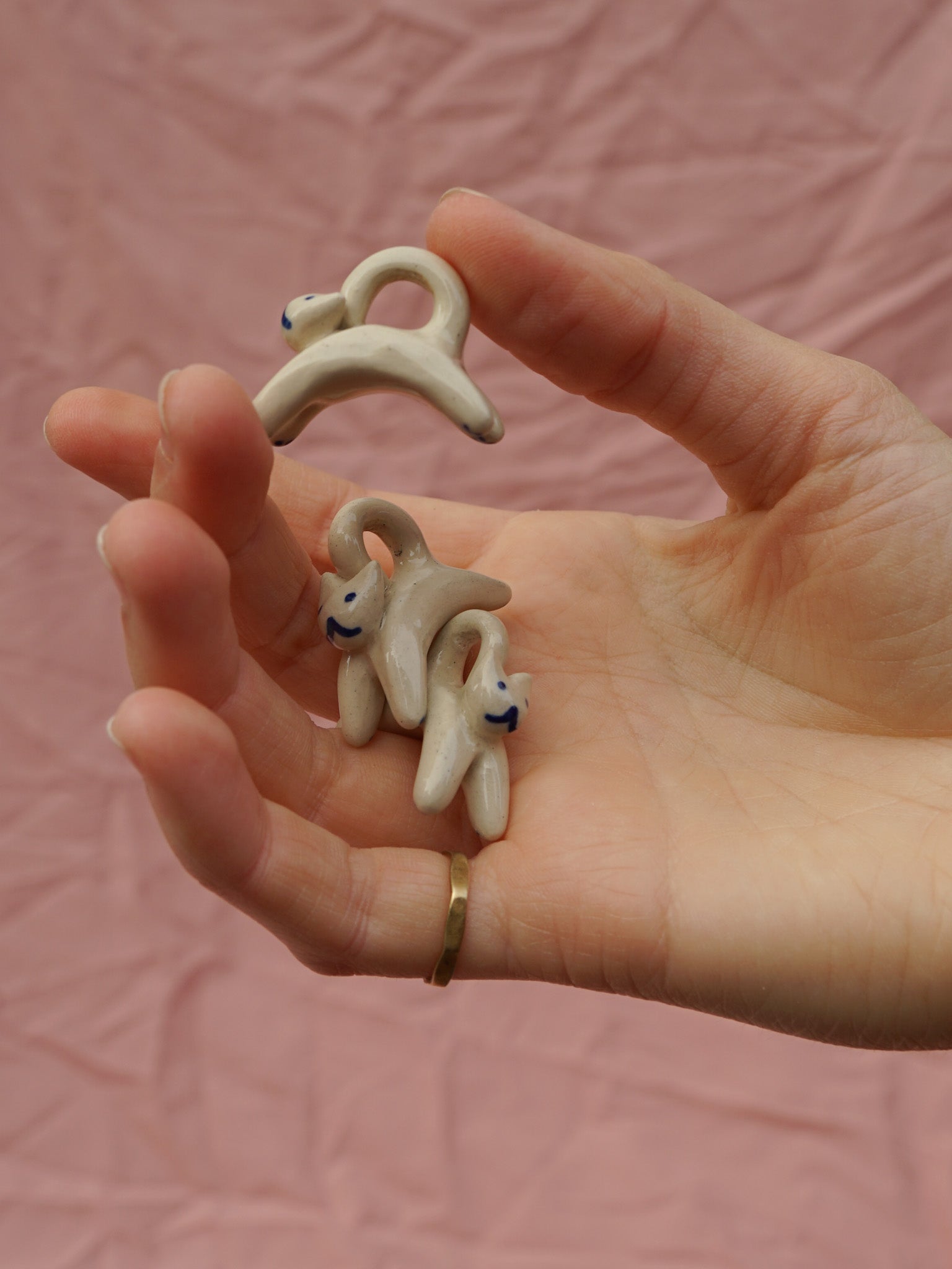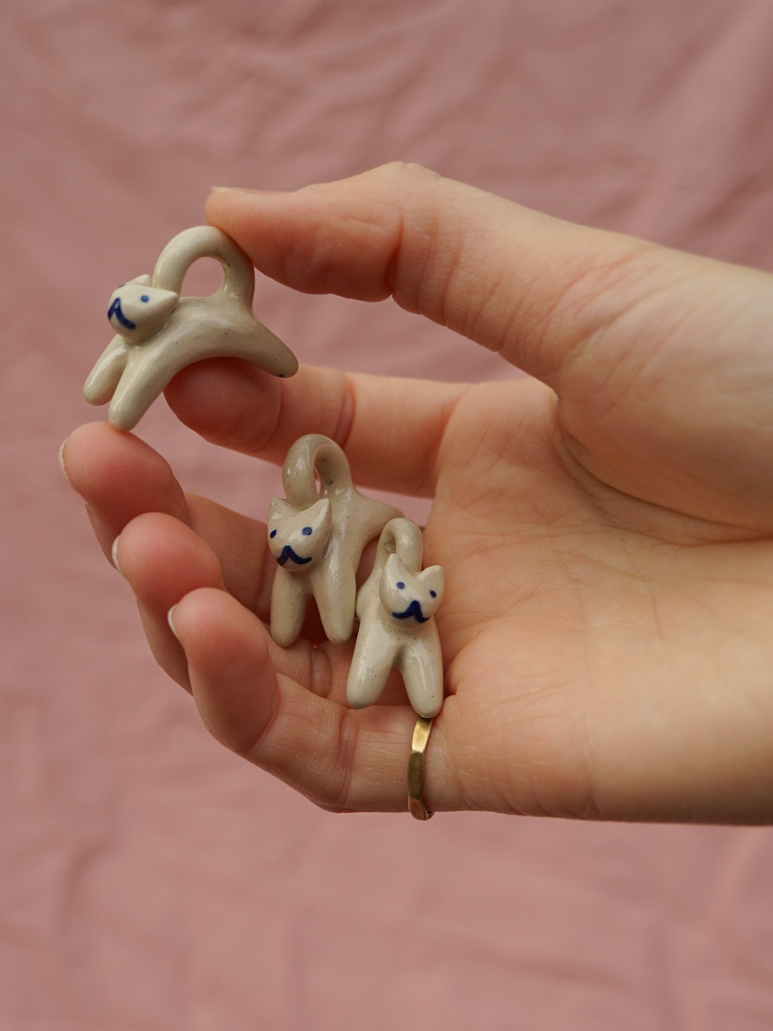 Tiny little white cats with navy blue faces and paws , made to hang on a necklace chain or through some hoop earrings , or sitting on a trinket shelf with some other tiny friends :-)